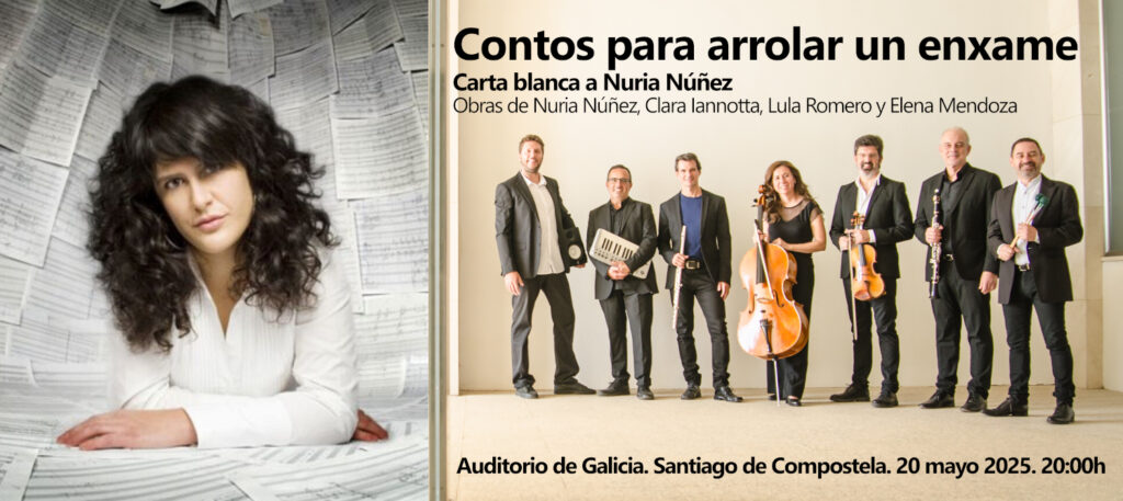 Nuestra propuesta consiste una carta blanca donde se presentan tres trabajos de la compositora Nuria Núñez Hierro que datan del año 2010 a 2025 incluyendo una nueva obra estreno en este concierto. Además, nuestro programa se completa con obras de compositoras estrechamente relacionadas con su trayectoria vital y estética (Elena Mendoza, Lula Romero y Clara Iannotta).