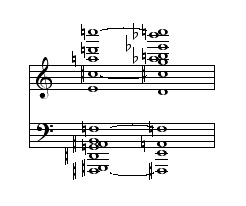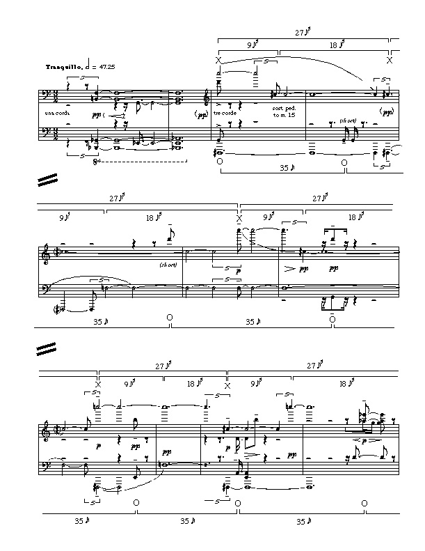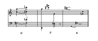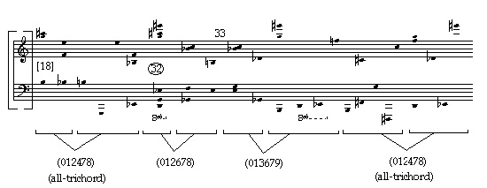 El ritmo de este pasaje es conducido por los dos flujos de la polirritmia subyacente. En el flujo más rápido las pulsaciones (marcadas por articulaciones cortas) tienen lugar cada 35 semicorcheas. En el flujo más lento las pulsaciones se suceden cada 27 corcheas de cinquillo, pulsación que se subdivide a su vez en un patrón yámbico de 9 + 18 corcheas de cinquillo. Armónicamente, el pasaje se basa en un acorde paninterválico (cpss. 3-8) y su inversión (cpss. 8-11). Ambos acordes poseen entre sí cuatro notas comunes: Fa#1, Fa3, Do#5 y Do7 (Ejemplo 2). Ejemplo 2 – Acorde paninterválico y su inversión Cpss. 1-11 de Night Fantasies