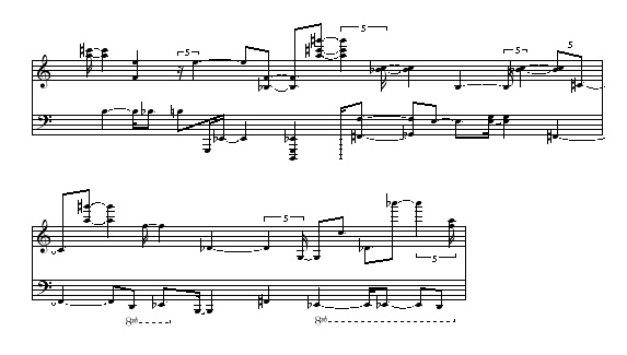 274316E985T (T589E613472) Como se dijo antes, a cada acorde junto con su inversión se le asigna un único número de catálogo. La numeración también empareja acordes relacionados por el proceso Q: el acorde número 2 es la forma Q de la inversión (entre paréntesis) del acorde número 1. Obsérvese también que los acordes 1 y 3 están relacionados por la operación que Andrew Mead llamó “intercambio tres y nueve” (llamémosla Ø), según la cual se intercambian las posiciones originales de los intervalos 3 y 9 (ver nota 7). Así, los 88 acordes de la lista definitiva de Carter se ordenan de esta manera: al primero de cada grupo podría llamársele “original”, el segundo sería la forma Q, el tercero la forma Ø y el cuarto la forma QØ. De todas las transformaciones de acordes paninterválicos RI-invariables descritas por los teóricos, la única que no se refleja en la numeración de Carter es la operación M5/M7. Las diferentes tablas de acordes paninterválicos y su cronología relativamente precisa son de una gran ayuda para el estudio de los bocetos de Night Fantasies. Siempre que en un boceto aparece la antigua numeración de acordes, este tuvo que haber sido escrito antes de finales de Junio o principios de Julio de 1979. Los bocetos en los que aparece la nueva numeración fueron escritos o vueltos a numerar después de esa fecha. Hay muchos bocetos en los que se han tachado los números antiguos y añadido los nuevos. Estos bocetos también nos proporcionan pistas en cuanto a qué materiales del proceso compositivo temprano Carter consideró lo suficientemente importantes como para revisarlos a partir de Julio. Así, por ejemplo, los bocetos de Enero de 1979 se ocupan principalmente de explorar las diferentes subdivisiones posibles dentro de la primera lista de 23 acordes paninterválicos. De la más de una docena de dichas tablas, todas las cuales se escribieron usando los números antiguos, sólo a una se le ha añadido la nueva numeración (I/79, nº 34). Este boceto es esencialmente un estudio de las subdivisiones del acorde número 1 (nueva numeración), acorde que da comienzo a las Night Fantasies y que Carter reseñó como “fuente” en los bocetos de mediados de Febrero. El desarrollo de una cantidad considerable de acordes paninterválicos no fue lo único que ocupó la atención de Carter en las fases iniciales de su trabajo sobre las Night Fantasies. Empleó también mucho tiempo en estudiar cómo los acordes podrían dar lugar a diversas agrupaciones menores. Una de las primeras y más importantes ideas armónicas de Carter fue el agrupar pequeñas entidades armónicas con el fin de hacer resaltar un determinado intervalo. Durante el año y medio que trabajó en la pieza, Carter realizó frecuentes bocetos con las indicaciones “1/11”, “2/10”, “3/9”, “4/8” o “5/7”, indicando así el tipo de intervalo que un boceto dado ponía de relieve[xvii]. De particular interés es un boceto que Carter hizo antes de la renumeración final de los acordes paninterválicos (UnKB, nº 28). Dicho boceto se divide en cinco filas, cada una de las cuales lleva la indicación de un tipo de intervalo y un tricordo o tetracordo simétrico asociado con ese tipo de intervalo: [0,1,2] para el intervalo de clase 1, [0,2,4] para el intervalo de clase 2, [0,3,6,9] para el de clase 3, [0,4,8] para el de clase 4 y [0,2,5,7] para el de clase 5. La primera columna de la tabla localiza esos conjuntos de notas en el acorde paninterválico 1, y la segunda hace lo mismo con el acorde paninterválico 3. El resto de la tabla localiza otros conjuntos que ponen de relieve un determinado tipo de intervalo en una variedad de acordes paninterválicos. Esta idea puede escucharse en la obra en las diferentes particiones del acorde 1 que resaltan un tipo concreto de intervalo. Al comienzo de la pieza (expuesta en el Ejemplo 1) el acorde 1 y su inversión sirven de fondo para una textura que pone de relieve el intervalo de clase 5. Cuando el acorde número 1 vuelve en los cpss. 38-39 se destaca el intervalo de clase 4, y en los cpss. 439-441 lo hace el intervalo de clase 1. De manera similar, Carter a veces utiliza un solo acorde paninterválico como fondo de un diálogo contrapuntístico entre dos clases de intervalos, como en los cpss. 150-156 en los que el intervalo de clase 2 (representado por el grupo [0,2,4]) y el intervalo de clase 4 (representado por el grupo [0,4,8]) son enfatizados dentro del acorde paninterválico número 1. A medida que exploraba las características armónicas de sus acordes paninterválicos, Carter también hizo numerosos pequeños bocetos sobre cómo esas características podrían tomar forma en una variedad de texturas pianísticas y contextos expresivos diferentes. Estos breves fragmentos musicales fueron parte del proceso dialéctico dentro del cual Carter compuso sus Night Fantasies. Los bocetos documentan un constante ir y venir entre la investigación de propiedades abstractas y la exploración de cómo tales propiedades podrían tener su realización musical. Así, por ejemplo, el mismo día que compiló la tabla de acordes paninterválicos del 18 de Febrero, Carter escribió también los bocetos reproducidos en el Ejemplo 8 (II/79, nº 26). Ejemplo 8a