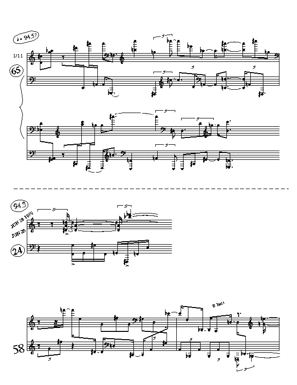 En el ejemplo 8a Carter escribe tres ejemplos del hexacordo pantriádico [0,1,2,4,7,8] extraído de los acordes paninterválicos 13, 17 y 16 (numeración antigua)[xviii]. Algo más abajo en esa misma página (ejemplo 8b) escribió una sucesión de cabezas de nota tomadas de los acordes paninterválicos 18, 32 y 33 (numeración antigua), dando nuevamente prioridad al hexacordo pantriádico. Finalmente, encajó el boceto previo en un esquema polirrítmico de seis semicorcheas de cinquillo en la mano derecha contra cinco (ocasionalmente seis) semicorcheas en la izquierda (Ejemplo 8c), resultando así un pasaje que encontramos de forma casi invariada en la partitura final (cpss. 33-35)[xix]. Carter siguió componiendo una gran cantidad de breves fragmentos musicales a lo largo de 1979. Cuando creyó haber acumulado un número suficiente de ellos, su siguiente tarea fue plantearse cómo debía disponer este material para dar a la composición un sentido de continuidad a gran escala. Empezó asignando un número, habitualmente escrito y circunvalado con un lápiz color púrpura, a más de 70 de esos fragmentos. Luego, simplemente, los colgó de la pared de su estudio y los fue ordenando hasta encontrar la disposición deseada[xx]. Carter usó los fragmentos reordenados como punto de partida para la composición del borrador de la partitura. Estos fragmentos le daban una idea de cómo sería la pieza a grandes rasgos, aunque veía claramente que serían necesarias más revisiones. Mientras fue trabajando descartó casi la mitad de los fragmentos y añadió una gran cantidad de materiales, algunos tomados de boceto antiguos, otros de nueva creación. Un ejemplo particularmente llamativo del tipo de revisiones que Carter llevó a cabo mientras trabajaba en el borrador de la partitura tiene que ver con un pasaje que comienza en el cps. 432 y continúa hasta el que posiblemente sea el clímax de la obra en el cps. 473. La continua y dramática acumulación creada en esos compases fue el resultado de la cuidadosa reelaboración de al menos cinco de los fragmentos numerados en púrpura y compuestos meses atrás. La primera parte de ese pasaje comienza como una serie de tres fragmentos – números 65, 24 y 58 – escritos en tiras de papel pautado que Carter pegó con cinta adhesiva para formar con ellas un boceto continuo (DDM, nº 14). En el Ejemplo 9 vemos el fragmento 65, el comienzo del fragmento 24 y la primera parte del fragmento 58. Ejemplo 9 – Extracto de los fragmentos 65, 24 y 58